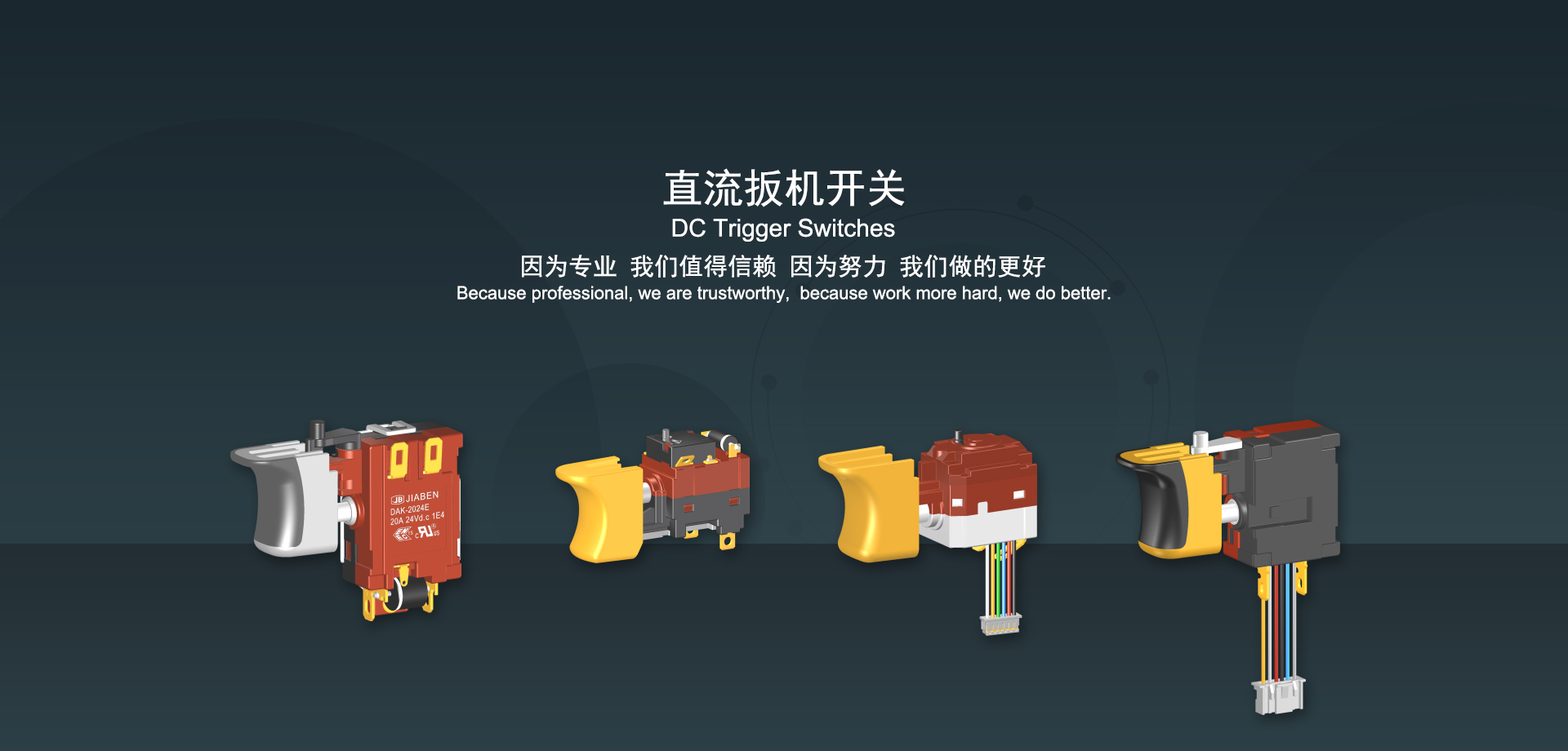 浙江佳奔電子有限公司始建于1986年,坐落于浙江省樂清市虹橋鎮東電子信息產業園內,現有職工700多人,資產總額超3億元。公司主要經營“JIABEN”牌微動開關、蹺板開關、按鈕開關、扳機開關、調速開關和電位器開關等各類交、直流器具開關和各類交、直流線路板模塊等產品,主要應用于交、直流電動工具、電動園林工具、清潔器具、家用電器和小型機床等行業,是集產品設計、研發(fā)、制造、銷售和服務于一體的國家高新技術企業。JIABEN was founded in 1986, located in East Electronic Information Industry Park, Hongqiao Town, Yueqing City, Zhejiang Proviance, existing staff more than 700 peoples, more than 300 million RMB worth of assets. Company is mainly engaged in "JIABEN" brand Micro Switch, Rocker Switch, Push-button Switch, Trigger Switch, Speed Regulating Switch, Potentiometer Switch and other kinds of appliance switch and all kinds of AC or DC circuit board module, such as more than 100 series, 8000 kinds of models of products, mainly used in AC or DC Power-tools, Power Gardening Tools, Cleaning Appliances, Household Appliances and Small Machine Tool and other industries, is the collection product design, research and development, manufacturing, sales and service in one of the national high and new technology enterprise.
